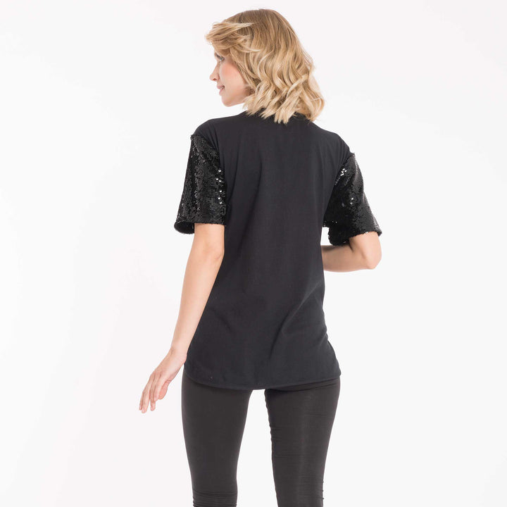 Camiseta de manga corta con cuello redondo, lentejuelas y texto central.