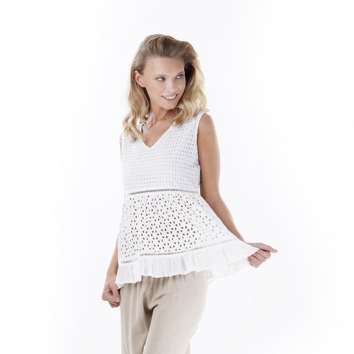 Esta camiseta sin mangas presenta refinados detalles en encaje Sangallo que añaden un toque de elegancia artesanal. Fabricada en algodón de alta calidad, garantiza comodidad y transpirabilidad perfectas para los días más calurosos. Ideal para un look fresco y sofisticado, combina estilo y practicidad en una prenda versátil.